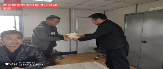 中筑公司总经理罗振华给刘璇极颁发了最进步劳动者奖。刘旋极2018年4月来阿,一直没有回国,在湖南中筑这个大熔炉中,他从一个不懂事的毛小孩锐变成机械操作能手,进步非常快。现能独挡一面,感恩公司有这种能刻苦学习本领的劳动者。