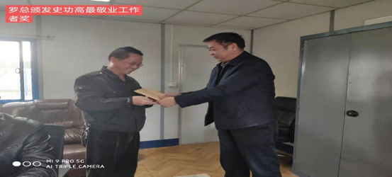 史功高自2018年6月来阿,因工种特殊,多次放弃回国休假机会,自始至终坚守在岗位上,对本职工作经常做到一丝不苟,处事经验丰富,乐于帮助他人,罗总给予颁发最敬业工作者奖。